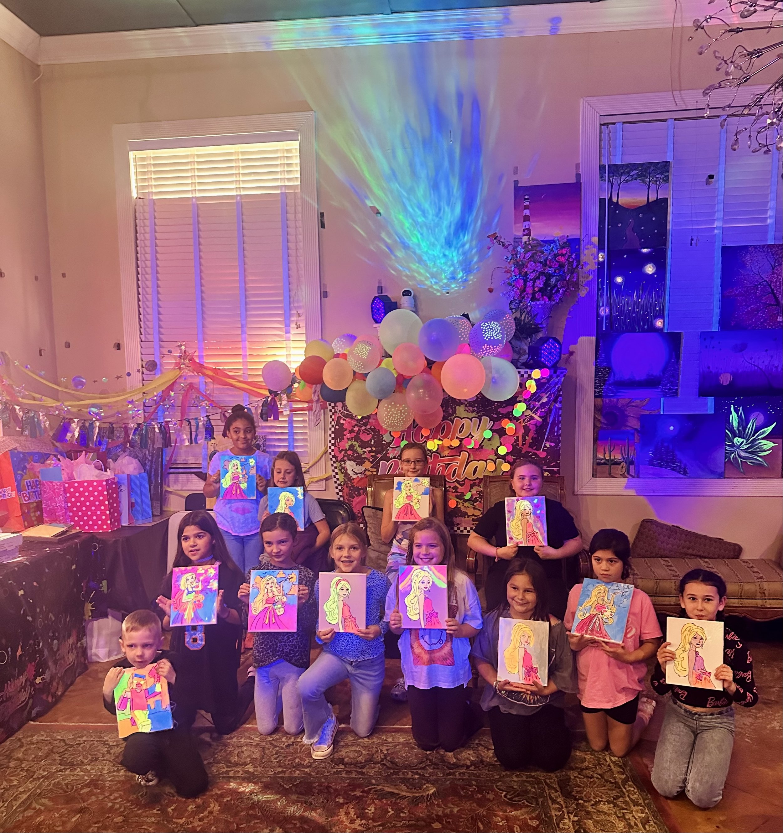 Glow paint parties are our most popular experience! Kids create vibrant artwork using neon paints under blacklights in a fun, instructor-led setting. We provide all supplies, customized themes, & best of all — zero cleanup for parents!